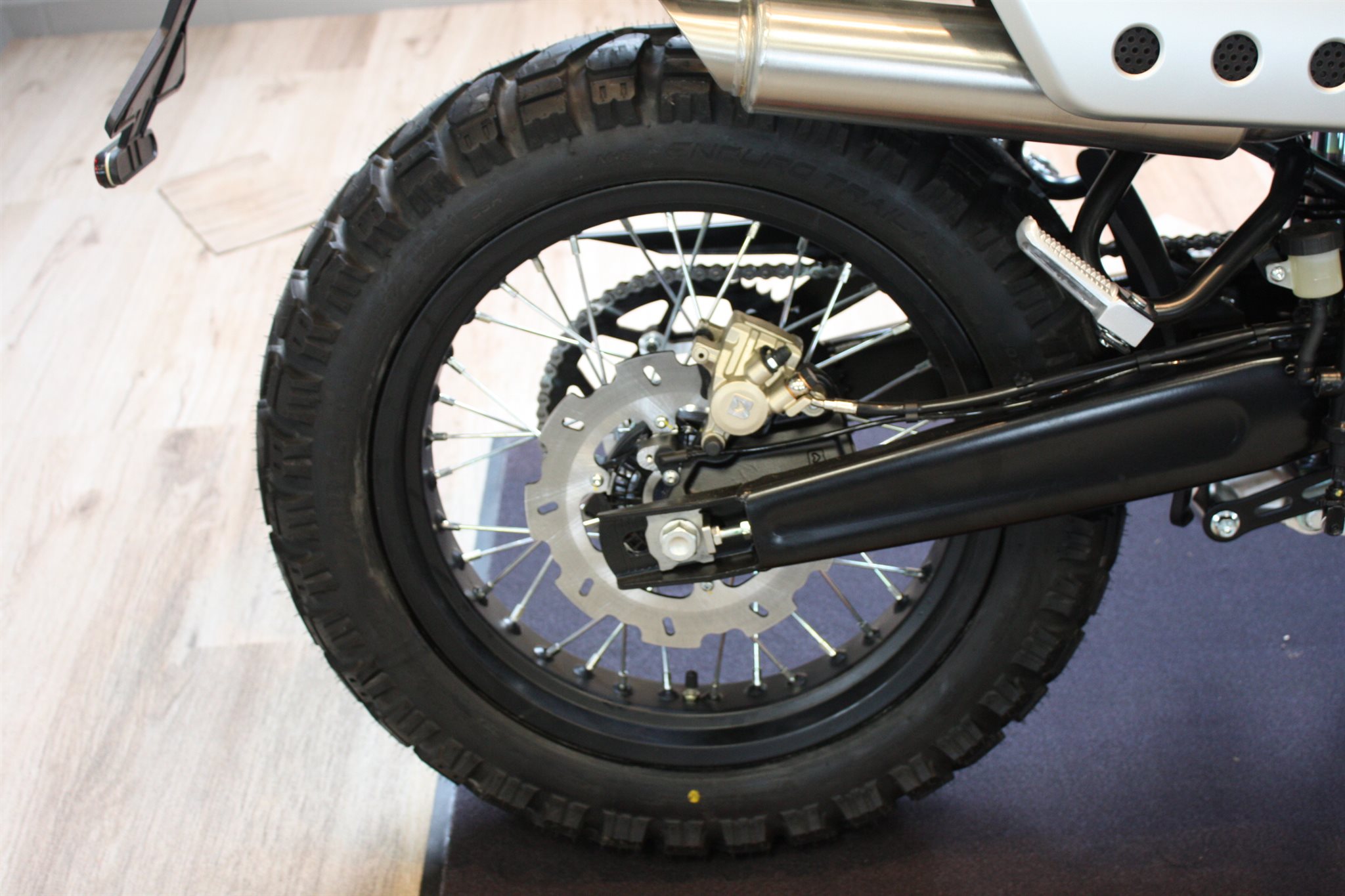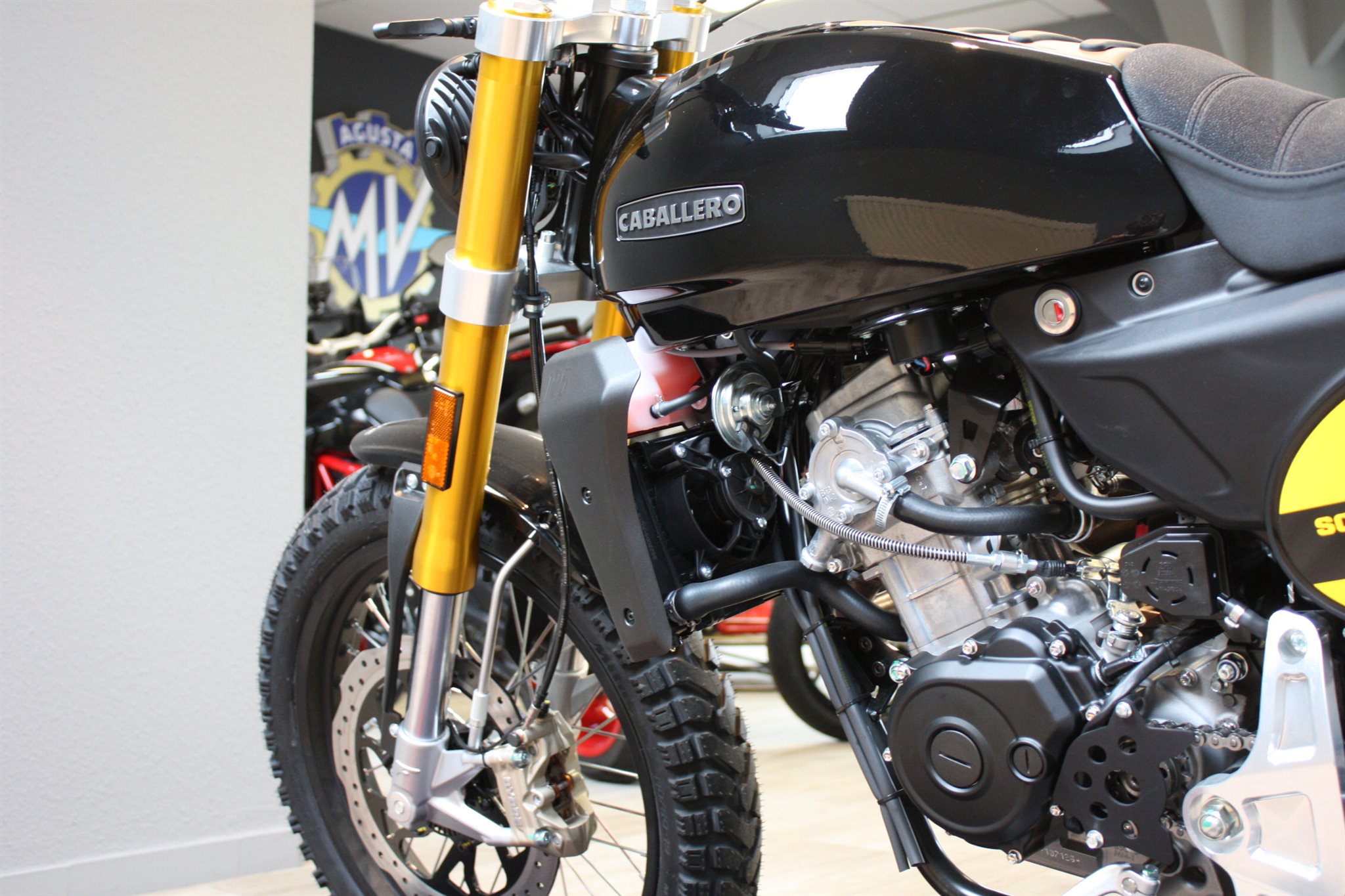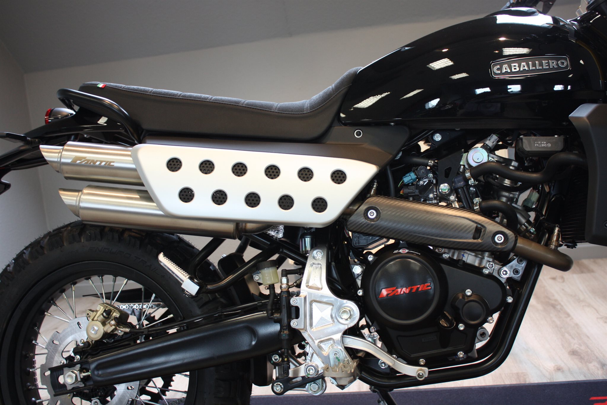 Die Caballero 125 ist mit einer neuen Auspuffanlage ausgestattet, die für optimale Leistung und einen noch mitreißenderen Sound entwickelt wurde. Euro 5+ zertifiziert, wurde der Auspuff überarbeitet, um die Effizienz zu verbessern und Emissionen zu reduzieren, ohne den aggressiven Charakter des Motorrads zu beeinträchtigen.